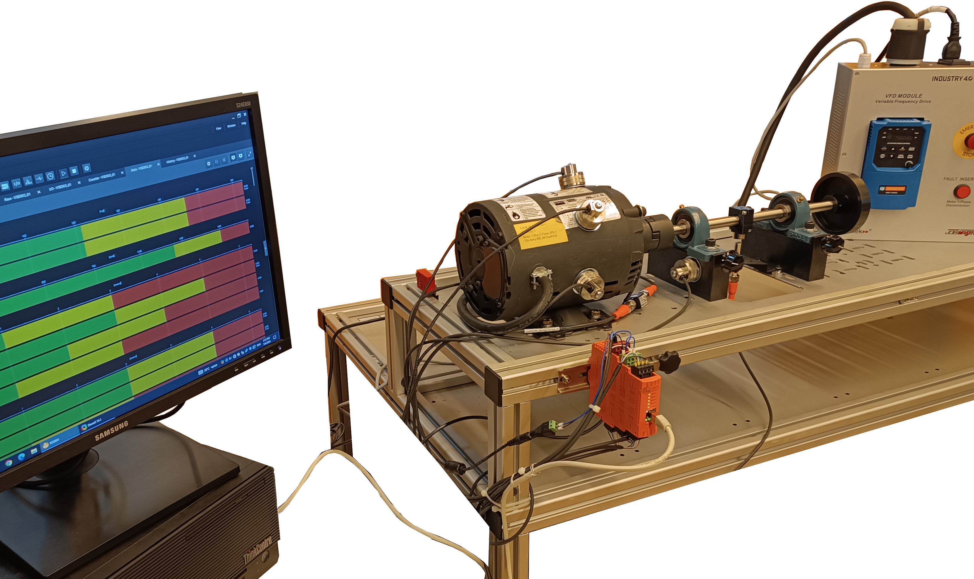 CBM sensor kit includes a magnetic sensor for monitoring rotational speed, a temperature sensor, and four all-important vibration sensors. The vibration sensors provide the bulk of the data used by the student-analysts, who will use the tools in the monitoring software to find machine abnormalities such as unbalance, looseness, and misalignment.